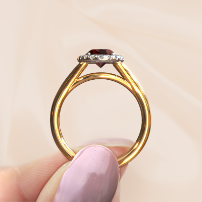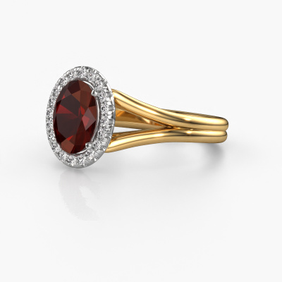 This 14 Carat gold ring is called Verla ovl 1 and is set with 8x6 mm garnet. This exclusive gold halo engagement ring is a true work of art! The ornaments are crafted with a lot of patience and great passion. In order to create this ring with great precision, this craft requires a keen eye and skilful hand. A challenge which ignites a fire in our expert goldsmith. The exquisite garnet are set in a special way so they stand out even more. This gives the ring an even more glamorous appearance. The split band engagement ring is actually unique on its own because of the gemstones which we carefully select especially for this ring. On top of that you select the precious metals which will be used to create a unique ring for the most extraordinary woman in your life! This jewel is made to shine bright around your finger. Each jewel is hand made with love by our goldsmiths.By using a combination of the latest modern techniques, combined with ancient crafting, we can make all our engagement rings in our own studio. Each jewel is made to order. This is advantageous because we can offer you a price you won't find anywhere else.Do you have a specific ring in mind? One you came across somewhere. Please feel free to tell us your wishes and we will turn your design into a unique engagement ring. You can follow the development of your ring design because we use 3D drawings. This gives you a realistic preview of your design. We will gladly send you a non-binding offer, based on a fair price/ quality ratio. It will amaze you.To make it easier for you, we offer a 30 day return policy. Check our terms and conditions.
