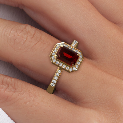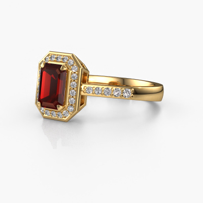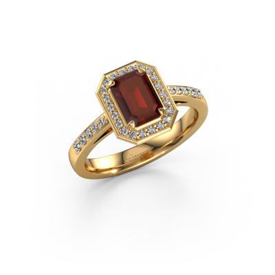 This 14 Carat gold ring is called Dodie 2 eme and is set with 7x5 mm garnet. This exclusive gold halo engagement ring is a true work of art! The ornaments are crafted with a lot of patience and great passion. In order to create this ring with great precision, this craft requires a keen eye and skilful hand. A challenge which ignites a fire in our expert goldsmith. The exquisite garnet are set in a special way so they stand out even more. This gives the ring an even more glamorous appearance. The pretty engagement ring is actually unique on its own because of the gemstones which we carefully select especially for this ring. On top of that you select the precious metals which will be used to create a unique ring for the most extraordinary woman in your life! This jewel is made just for you, with attention to detail and design.Because we design and deliver our own rings, we can offer you a engagement ring at a price you won't find anywhere else. A ring is made to order, which helps prevent excess supplies, so we can make you a great price offer. We understand it feels risky, buying your engagement ring online, but we will gladly assist in the designing process, taking your budget into consideration.Do you have a specific ring in mind? One you came across somewhere. Please feel free to tell us your wishes and we will turn your design into a unique engagement ring. You can follow the development of your ring design because we use 3D drawings. This gives you a realistic preview of your design. We will gladly send you a non-binding offer, based on a fair price/ quality ratio. It will amaze you.To make it easier for you, we offer a 30 day return policy. Check our terms and conditions.