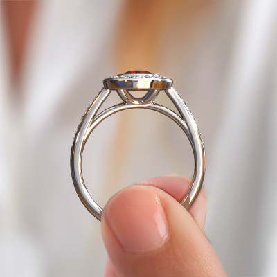 The ring shown above is called the Noud 2 RND. We call this type of ring a halo ring because it has one centre gemstone and a band that is also pave set with gemstones. The platinum engagement ring is set with a round 5 mm garnet centre stone and the band is pave set with diamonds. What makes this luxury platinum halo ring special are the smaller sized stones embracing the centre stone. This gorgeous engagement ring is called a halo ring because the smaller gemstones give the centre stone a halo of surrounding light. In order for the smaller stones to enhance the centre stone, they have to be placed so there is no interference of light. And that's when our expert goldsmiths come in. Each individual stone is carefully set in the ring by hand. During manufacturing, light fall is constantly monitored to make sure the special halo is still visible. In the end you get a unique engagement ring, with a garnet of your choosing at its centre. You can imagine the effect of a ring of such significance when you give it to her on her special day to shine. By using a combination of the latest modern techniques, combined with ancient crafting, we can make all our engagement rings in our own studio. Each jewel is made to order. This is advantageous because we can offer you a price you won't find anywhere else.Have you found a specific engagement ring somewhere which you would like to give to your loved one? Please feel free to express your wishes to our jewel designers because we would be honoured to turn your design into a luxury engagement ring. You can follow the development of your ring design because we use 3D drawings. This gives you a realistic preview of how your design will look. You can also preorder a dummy. A dummy is a plastic ring, which can be shaped according your ring design. You can try it on and check if its width and size are suitable for you. We will gladly send you a non-binding offer, based on a fair price/ quality ratio. It will amaze you, considering the quality of the ring and gemstones.To make it easier for you, we offer a 30 day return policy. Check our terms and conditions.