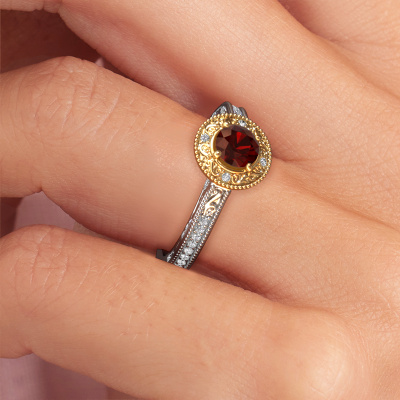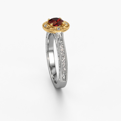 This 14 Carat white gold ring is called Alice RND and is set with 5 mm garnet. An extraordinary white gold vintage ring. One that will surely make the love of your life shine like a diamond! That is what we hope to achieve. This vintage Engagement ring is set with exquisite garnet. Whichever gemstone you choose from our selection, is up to you. The gemstone is selected with great care because we believe your pearl edges Engagement ring must be adorned with nothing but the most beautiful gemstone. Wouldn't you agree? Our expert goldsmith will design your ring in our own crafting studio, where the garnet will be set with great precision. The ring will then be polished till it shines perfectly. Nothing but the best for the love of your life! This jewel is made to shine bright around your finger. Each jewel is hand made with love by our goldsmiths.Are you on a budget? Please feel free to contact us, so we can go discuss your options. We offer our Engagement rings at guaranteed best price, because we make them to order. You won't find such a price anywhere else!Our team adds new designs to our online collection daily. Our designers and goldsmiths work together in creating the best design. We strive to offer a diverse collection of jewels. Perhaps you have a specific jewel design in mind. One you came across somewhere. Please contact us for a free consultation. We will make you an offer, based on a fair price/ quality ratio, that will baffle you.To make it easier for you, we offer a 30 day return policy. Check our terms and conditions.
