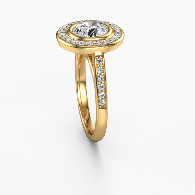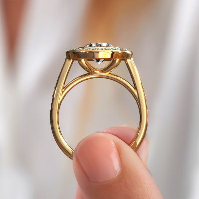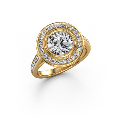The ring shown above is called the Noud 2 RND. We call this type of ring a halo ring because it has one centre gemstone and a band that is also pave set with gemstones. The 14 Carat gold engagement ring is set with a round 1.50 crt lab grown diamond centre stone and the band is pave set with diamonds. What makes this luxury gold halo ring special are the smaller sized stones embracing the centre stone. This gorgeous engagement ring is called a halo ring because the smaller gemstones give the centre stone a halo of surrounding light. In order for the smaller stones to enhance the centre stone, they have to be placed so there is no interference of light. And that's when our expert goldsmiths come in. Each individual stone is carefully set in the ring by hand. During manufacturing, light fall is constantly monitored to make sure the special halo is still visible. In the end you get a unique engagement ring, with a lab grown diamond of your choosing at its centre. You can imagine the effect of a ring of such significance when you give it to her on her special day to shine. By using a combination of the latest modern techniques, combined with ancient crafting, we can make all our engagement rings in our own studio. Each jewel is made to order. This is advantageous because we can offer you a price you won't find anywhere else.Have you found a specific engagement ring somewhere which you would like to give to your loved one? Please feel free to express your wishes to our jewel designers because we would be honoured to turn your design into a luxury engagement ring. You can follow the development of your ring design because we use 3D drawings. This gives you a realistic preview of how your design will look. You can also preorder a dummy. A dummy is a plastic ring, which can be shaped according your ring design. You can try it on and check if its width and size are suitable for you. We will gladly send you a non-binding offer, based on a fair price/ quality ratio. It will amaze you, considering the quality of the ring and gemstones.To make it easier for you, we offer a 30 day return policy. Check our terms and conditions.