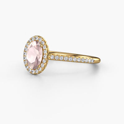 The ring shown above is called the Seline ovl 2. We call this type of ring a halo ring because it has one centre gemstone and a band that is also pave set with gemstones. The 14 Carat gold engagement ring is set with a oval 7x5 mm morganite champagne centre stone and the band is pave set with diamonds. What makes this exclusive gold halo ring special are the smaller sized stones embracing the centre stone. This gorgeous engagement ring is called a halo ring because the smaller gemstones give the centre stone a halo of surrounding light. In order for the smaller stones to enhance the centre stone, they have to be placed so there is no interference of light. And that's when our expert goldsmiths come in. Each individual stone is carefully set in the ring by hand. During manufacturing, light fall is constantly monitored to make sure the special halo is still visible. In the end you get a unique engagement ring, with a morganite champagne of your choosing at its centre. You can imagine the effect of a ring of such significance when you give it to her on her special day to shine. After receiving your order, our goldsmiths will start the creative process of making your Seline ovl 2 engagement ring. We don't keep stock. This is advantageous because these costs will not be passed on to you. Therefore, we can offer jewellery at exceptionally low prices.Our team adds new designs to our online collection daily. Our designers and goldsmiths work together in creating the best design. We strive to offer a diverse collection of jewels. Perhaps you have a specific jewel design in mind. One you came across somewhere. Please contact us for a free consultation. We will make you an offer, based on a fair price/ quality ratio, that will baffle you.To make it easier for you, we offer a 30 day return policy. Check our terms and conditions.