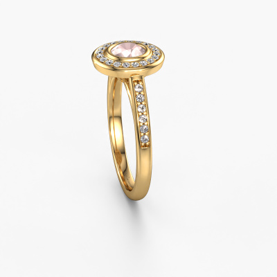 The ring shown above is called the Noud 2 RND. We call this type of ring a halo ring because it has one centre gemstone and a band that is also pave set with gemstones. The 14 Carat gold engagement ring is set with a round 5 mm morganite champagne centre stone and the band is pave set with diamonds. What makes this luxury gold halo ring special are the smaller sized stones embracing the centre stone. This gorgeous engagement ring is called a halo ring because the smaller gemstones give the centre stone a halo of surrounding light. In order for the smaller stones to enhance the centre stone, they have to be placed so there is no interference of light. And that's when our expert goldsmiths come in. Each individual stone is carefully set in the ring by hand. During manufacturing, light fall is constantly monitored to make sure the special halo is still visible. In the end you get a unique engagement ring, with a morganite champagne of your choosing at its centre. You can imagine the effect of a ring of such significance when you give it to her on her special day to shine. By using a combination of the latest modern techniques, combined with ancient crafting, we can make all our engagement rings in our own studio. Each jewel is made to order. This is advantageous because we can offer you a price you won't find anywhere else.Have you found a specific engagement ring somewhere which you would like to give to your loved one? Please feel free to express your wishes to our jewel designers because we would be honoured to turn your design into a luxury engagement ring. You can follow the development of your ring design because we use 3D drawings. This gives you a realistic preview of how your design will look. You can also preorder a dummy. A dummy is a plastic ring, which can be shaped according your ring design. You can try it on and check if its width and size are suitable for you. We will gladly send you a non-binding offer, based on a fair price/ quality ratio. It will amaze you, considering the quality of the ring and gemstones.To make it easier for you, we offer a 30 day return policy. Check our terms and conditions.