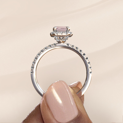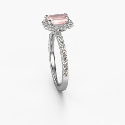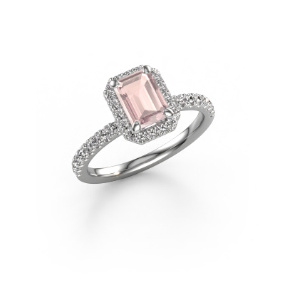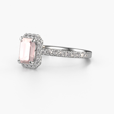 The ring shown above is called the Miranda eme. We call this type of ring a halo ring because it has one centre gemstone and a band that is also pave set with gemstones. The 14 Carat white gold engagement ring is set with a emerald cut 7x5 mm morganite champagne centre stone and the band is pave set with diamonds. What makes this classic white gold halo ring special are the smaller sized stones embracing the centre stone. This gorgeous engagement ring is called a halo ring because the smaller gemstones give the centre stone a halo of surrounding light. In order for the smaller stones to enhance the centre stone, they have to be placed so there is no interference of light. And that's when our expert goldsmiths come in. Each individual stone is carefully set in the ring by hand. During manufacturing, light fall is constantly monitored to make sure the special halo is still visible. In the end you get a unique engagement ring, with a morganite champagne of your choosing at its centre. You can imagine the effect of a ring of such significance when you give it to her on her special day to shine. By using a combination of the latest modern techniques, combined with ancient crafting, we can make all our engagement rings in our own studio. Each jewel is made to order. This is advantageous because we can offer you a price you won't find anywhere else.Our designers and goldsmiths work together each day, creating new jewels. Perhaps you have found a nice classic engagement ring somewhere, which can be used to customize your unique ring. Please feel free to contact us. We will make you an offer, based on a fair price/ quality ratio, which will amaze you.To make it easier for you, we offer a 30 day return policy. Check our terms and conditions.
