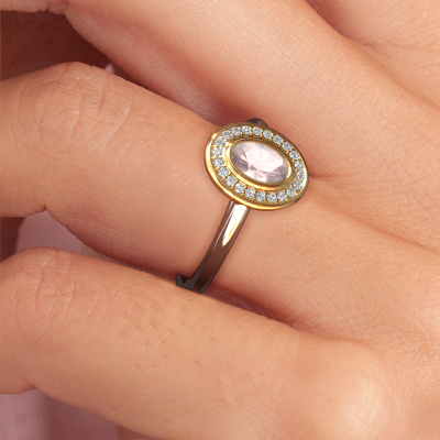 The ring shown above is called the Noud 1 OVL. We call this type of ring a halo ring because it has one centre gemstone and a band that is also pave set with gemstones. The 14 Carat white gold engagement ring is set with a oval 6x4 mm morganite champagne centre stone and the band is pave set with lab-grown diamonds. What makes this classic white gold halo ring special are the smaller sized stones embracing the centre stone. This gorgeous engagement ring is called a halo ring because the smaller gemstones give the centre stone a halo of surrounding light. In order for the smaller stones to enhance the centre stone, they have to be placed so there is no interference of light. And that's when our expert goldsmiths come in. Each individual stone is carefully set in the ring by hand. During manufacturing, light fall is constantly monitored to make sure the special halo is still visible. In the end you get a unique engagement ring, with a morganite champagne of your choosing at its centre. You can imagine the effect of a ring of such significance when you give it to her on her special day to shine. By using a combination of the latest modern techniques, combined with ancient crafting, we can make all our engagement rings in our own studio. Each jewel is made to order. This is advantageous because we can offer you a price you won't find anywhere else.Our team adds new designs to our online collection daily. Our designers and goldsmiths work together in creating the best design. We strive to offer a diverse collection of jewels. Perhaps you have a specific jewel design in mind. One you came across somewhere. Please contact us for a free consultation. We will make you an offer, based on a fair price/ quality ratio, that will baffle you.To make it easier for you, we offer a 30 day return policy. Check our terms and conditions.