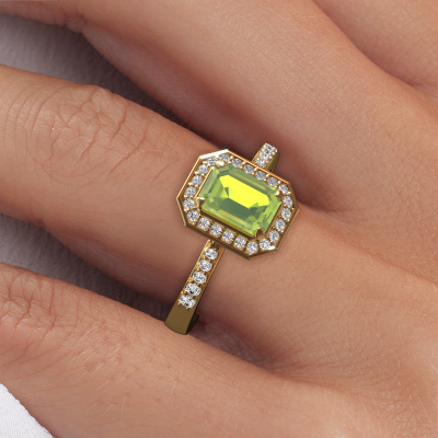 This 14 Carat gold ring is called Dodie 2 eme and is set with 7x5 mm peridot. This exclusive gold halo engagement ring is a true work of art! The ornaments are crafted with a lot of patience and great passion. In order to create this ring with great precision, this craft requires a keen eye and skilful hand. A challenge which ignites a fire in our expert goldsmith. The exquisite peridot are set in a special way so they stand out even more. This gives the ring an even more glamorous appearance. The pretty engagement ring is actually unique on its own because of the gemstones which we carefully select especially for this ring. On top of that you select the precious metals which will be used to create a unique ring for the most extraordinary woman in your life! This jewel is made just for you, with attention to detail and design.Because we design and deliver our own rings, we can offer you a engagement ring at a price you won't find anywhere else. A ring is made to order, which helps prevent excess supplies, so we can make you a great price offer. We understand it feels risky, buying your engagement ring online, but we will gladly assist in the designing process, taking your budget into consideration.Do you have a specific ring in mind? One you came across somewhere. Please feel free to tell us your wishes and we will turn your design into a unique engagement ring. You can follow the development of your ring design because we use 3D drawings. This gives you a realistic preview of your design. We will gladly send you a non-binding offer, based on a fair price/ quality ratio. It will amaze you.To make it easier for you, we offer a 30 day return policy. Check our terms and conditions.