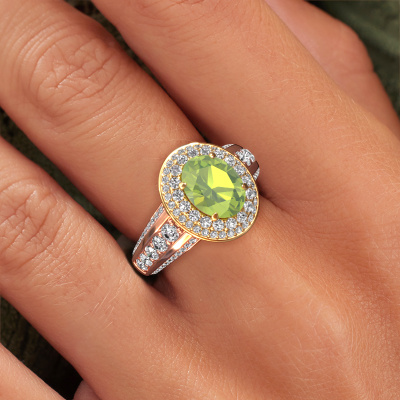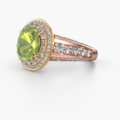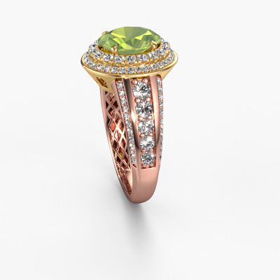 This 14 Carat rose gold ring is called Nancie and is set with 9x7 mm peridot. This exclusive rose gold halo engagement ring is a true work of art! The ornaments are crafted with a lot of patience and great passion. In order to create this ring with great precision, this craft requires a keen eye and skilful hand. A challenge which ignites a fire in our expert goldsmith. The exquisite peridot are set in a special way so they stand out even more. This gives the ring an even more glamorous appearance. The graceful engagement ring is actually unique on its own because of the gemstones which we carefully select especially for this ring. On top of that you select the precious metals which will be used to create a unique ring for the most extraordinary woman in your life! This jewel is created to add sparkle to your finger, each jewel is lovingly made by hand by our goldsmiths.Are you on a budget? Please feel free to contact us, so we can go discuss your options. We offer our engagement rings at guaranteed best price, because we make them to order. You won't find such a price anywhere else!Our designers and goldsmiths work together each day, creating new jewels. Perhaps you have found a nice classic engagement ring somewhere, which can be used to customize your unique ring. Please feel free to contact us. We will make you an offer, based on a fair price/ quality ratio, which will amaze you.To make it easier for you, we offer a 30 day return policy. Check our terms and conditions.