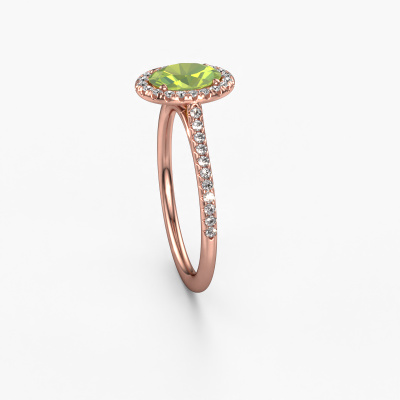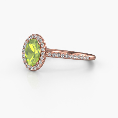 The ring shown above is called the Seline ovl 2. We call this type of ring a halo ring because it has one centre gemstone and a band that is also pave set with gemstones. The 14 Carat rose gold engagement ring is set with a oval 7x5 mm peridot centre stone and the band is pave set with diamonds. What makes this exclusive rose gold halo ring special are the smaller sized stones embracing the centre stone. This gorgeous engagement ring is called a halo ring because the smaller gemstones give the centre stone a halo of surrounding light. In order for the smaller stones to enhance the centre stone, they have to be placed so there is no interference of light. And that's when our expert goldsmiths come in. Each individual stone is carefully set in the ring by hand. During manufacturing, light fall is constantly monitored to make sure the special halo is still visible. In the end you get a unique engagement ring, with a peridot of your choosing at its centre. You can imagine the effect of a ring of such significance when you give it to her on her special day to shine. After receiving your order, our goldsmiths will start the creative process of making your Seline ovl 2 engagement ring. We don't keep stock. This is advantageous because these costs will not be passed on to you. Therefore, we can offer jewellery at exceptionally low prices.Our team adds new designs to our online collection daily. Our designers and goldsmiths work together in creating the best design. We strive to offer a diverse collection of jewels. Perhaps you have a specific jewel design in mind. One you came across somewhere. Please contact us for a free consultation. We will make you an offer, based on a fair price/ quality ratio, that will baffle you.To make it easier for you, we offer a 30 day return policy. Check our terms and conditions.