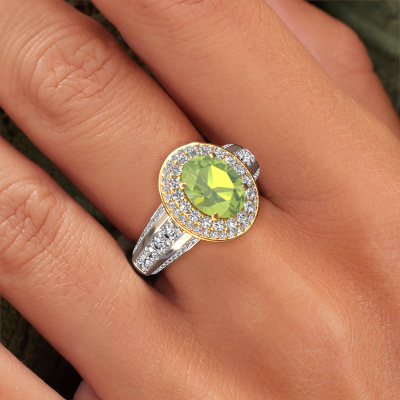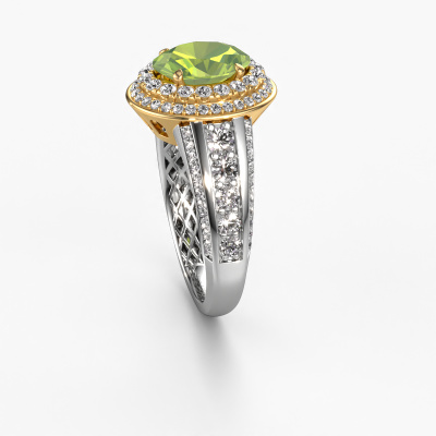 This 14 Carat white gold ring is called Nancie and is set with 9x7 mm peridot. This exclusive white gold halo engagement ring is a true work of art! The ornaments are crafted with a lot of patience and great passion. In order to create this ring with great precision, this craft requires a keen eye and skilful hand. A challenge which ignites a fire in our expert goldsmith. The exquisite peridot are set in a special way so they stand out even more. This gives the ring an even more glamorous appearance. The graceful engagement ring is actually unique on its own because of the gemstones which we carefully select especially for this ring. On top of that you select the precious metals which will be used to create a unique ring for the most extraordinary woman in your life! This jewel is created to add sparkle to your finger, each jewel is lovingly made by hand by our goldsmiths.Are you on a budget? Please feel free to contact us, so we can go discuss your options. We offer our engagement rings at guaranteed best price, because we make them to order. You won't find such a price anywhere else!Our designers and goldsmiths work together each day, creating new jewels. Perhaps you have found a nice classic engagement ring somewhere, which can be used to customize your unique ring. Please feel free to contact us. We will make you an offer, based on a fair price/ quality ratio, which will amaze you.To make it easier for you, we offer a 30 day return policy. Check our terms and conditions.