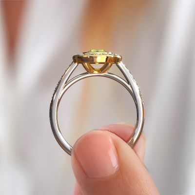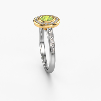 The ring shown above is called the Noud 2 RND. We call this type of ring a halo ring because it has one centre gemstone and a band that is also pave set with gemstones. The 14 Carat white gold engagement ring is set with a round 5 mm peridot centre stone and the band is pave set with diamonds. What makes this luxury white gold halo ring special are the smaller sized stones embracing the centre stone. This gorgeous engagement ring is called a halo ring because the smaller gemstones give the centre stone a halo of surrounding light. In order for the smaller stones to enhance the centre stone, they have to be placed so there is no interference of light. And that's when our expert goldsmiths come in. Each individual stone is carefully set in the ring by hand. During manufacturing, light fall is constantly monitored to make sure the special halo is still visible. In the end you get a unique engagement ring, with a peridot of your choosing at its centre. You can imagine the effect of a ring of such significance when you give it to her on her special day to shine. By using a combination of the latest modern techniques, combined with ancient crafting, we can make all our engagement rings in our own studio. Each jewel is made to order. This is advantageous because we can offer you a price you won't find anywhere else.Have you found a specific engagement ring somewhere which you would like to give to your loved one? Please feel free to express your wishes to our jewel designers because we would be honoured to turn your design into a luxury engagement ring. You can follow the development of your ring design because we use 3D drawings. This gives you a realistic preview of how your design will look. You can also preorder a dummy. A dummy is a plastic ring, which can be shaped according your ring design. You can try it on and check if its width and size are suitable for you. We will gladly send you a non-binding offer, based on a fair price/ quality ratio. It will amaze you, considering the quality of the ring and gemstones.To make it easier for you, we offer a 30 day return policy. Check our terms and conditions.