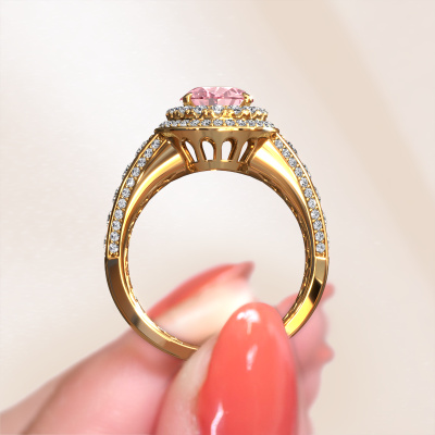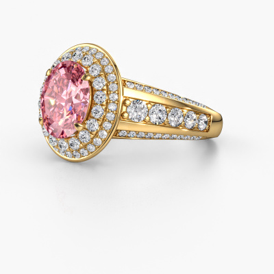 This 14 Carat gold ring is called Nancie and is set with 9x7 mm pink lab grown diamond. This exclusive gold halo engagement ring is a true work of art! The ornaments are crafted with a lot of patience and great passion. In order to create this ring with great precision, this craft requires a keen eye and skilful hand. A challenge which ignites a fire in our expert goldsmith. The exquisite pink lab grown diamonds are set in a special way so they stand out even more. This gives the ring an even more glamorous appearance. The graceful engagement ring is actually unique on its own because of the gemstones which we carefully select especially for this ring. On top of that you select the precious metals which will be used to create a unique ring for the most extraordinary woman in your life! This jewel is created to add sparkle to your finger, each jewel is lovingly made by hand by our goldsmiths.Are you on a budget? Please feel free to contact us, so we can go discuss your options. We offer our engagement rings at guaranteed best price, because we make them to order. You won't find such a price anywhere else!Our designers and goldsmiths work together each day, creating new jewels. Perhaps you have found a nice classic engagement ring somewhere, which can be used to customize your unique ring. Please feel free to contact us. We will make you an offer, based on a fair price/ quality ratio, which will amaze you.To make it easier for you, we offer a 30 day return policy. Check our terms and conditions.