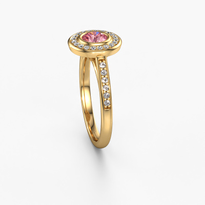 The ring shown above is called the Noud 2 RND. We call this type of ring a halo ring because it has one centre gemstone and a band that is also pave set with gemstones. The 14 Carat gold engagement ring is set with a round 5 mm pink lab grown diamond centre stone and the band is pave set with diamonds. What makes this luxury gold halo ring special are the smaller sized stones embracing the centre stone. This gorgeous engagement ring is called a halo ring because the smaller gemstones give the centre stone a halo of surrounding light. In order for the smaller stones to enhance the centre stone, they have to be placed so there is no interference of light. And that's when our expert goldsmiths come in. Each individual stone is carefully set in the ring by hand. During manufacturing, light fall is constantly monitored to make sure the special halo is still visible. In the end you get a unique engagement ring, with a pink lab grown diamond of your choosing at its centre. You can imagine the effect of a ring of such significance when you give it to her on her special day to shine. By using a combination of the latest modern techniques, combined with ancient crafting, we can make all our engagement rings in our own studio. Each jewel is made to order. This is advantageous because we can offer you a price you won't find anywhere else.Have you found a specific engagement ring somewhere which you would like to give to your loved one? Please feel free to express your wishes to our jewel designers because we would be honoured to turn your design into a luxury engagement ring. You can follow the development of your ring design because we use 3D drawings. This gives you a realistic preview of how your design will look. You can also preorder a dummy. A dummy is a plastic ring, which can be shaped according your ring design. You can try it on and check if its width and size are suitable for you. We will gladly send you a non-binding offer, based on a fair price/ quality ratio. It will amaze you, considering the quality of the ring and gemstones.To make it easier for you, we offer a 30 day return policy. Check our terms and conditions.