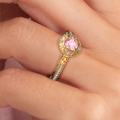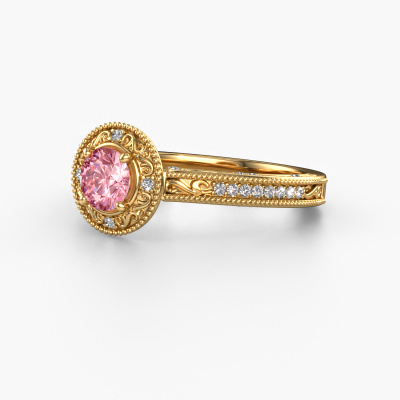 This 14 Carat gold ring is called Alice RND and is set with 5 mm pink lab grown diamond. An extraordinary gold vintage ring. One that will surely make the love of your life shine like a diamond! That is what we hope to achieve. This vintage Engagement ring is set with exquisite pink lab grown diamond. Whichever gemstone you choose from our selection, is up to you. The gemstone is selected with great care because we believe your pearl edges Engagement ring must be adorned with nothing but the most beautiful gemstone. Wouldn't you agree? Our expert goldsmith will design your ring in our own crafting studio, where the pink lab grown diamond will be set with great precision. The ring will then be polished till it shines perfectly. Nothing but the best for the love of your life! This jewel is made to shine bright around your finger. Each jewel is hand made with love by our goldsmiths.Are you on a budget? Please feel free to contact us, so we can go discuss your options. We offer our Engagement rings at guaranteed best price, because we make them to order. You won't find such a price anywhere else!Our team adds new designs to our online collection daily. Our designers and goldsmiths work together in creating the best design. We strive to offer a diverse collection of jewels. Perhaps you have a specific jewel design in mind. One you came across somewhere. Please contact us for a free consultation. We will make you an offer, based on a fair price/ quality ratio, that will baffle you.To make it easier for you, we offer a 30 day return policy. Check our terms and conditions.