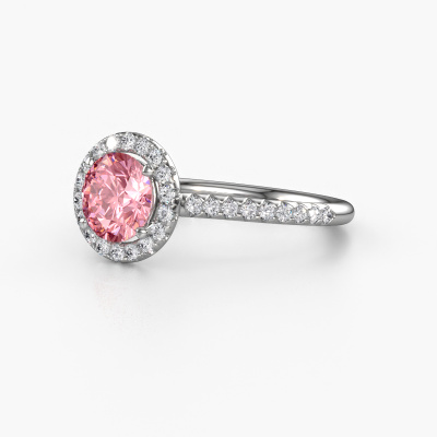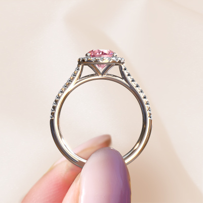 The ring shown above is called the Seline rnd 2. We call this type of ring a halo ring because it has one centre gemstone and a band that is also pave set with gemstones. The platinum engagement ring is set with a round 6.5 mm pink lab grown diamond centre stone and the band is pave set with lab-grown diamonds. What makes this exclusive platinum halo ring special are the smaller sized stones embracing the centre stone. This gorgeous engagement ring is called a halo ring because the smaller gemstones give the centre stone a halo of surrounding light. In order for the smaller stones to enhance the centre stone, they have to be placed so there is no interference of light. And that's when our expert goldsmiths come in. Each individual stone is carefully set in the ring by hand. During manufacturing, light fall is constantly monitored to make sure the special halo is still visible. In the end you get a unique engagement ring, with a pink lab grown diamond of your choosing at its centre. You can imagine the effect of a ring of such significance when you give it to her on her special day to shine. After receiving your order, our goldsmiths will start the creative process of making your Seline rnd 2 engagement ring. We don't keep stock. This is advantageous because these costs will not be passed on to you. Therefore, we can offer jewellery at exceptionally low prices.Our team adds new designs to our online collection daily. Our designers and goldsmiths work together in creating the best design. We strive to offer a diverse collection of jewels. Perhaps you have a specific jewel design in mind. One you came across somewhere. Please contact us for a free consultation. We will make you an offer, based on a fair price/ quality ratio, that will baffle you.To make it easier for you, we offer a 30 day return policy. Check our terms and conditions.