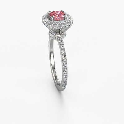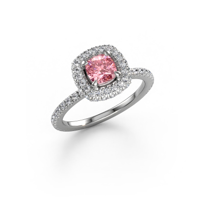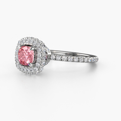 The ring shown above is called the Talitha CUS. We call this type of ring a halo ring because it has one centre gemstone and a band that is also pave set with gemstones. The platinum engagement ring is set with a cushion 5 mm pink lab grown diamond centre stone and the band is pave set with diamonds. What makes this traditional platinum halo ring special are the smaller sized stones embracing the centre stone. This gorgeous engagement ring is called a halo ring because the smaller gemstones give the centre stone a halo of surrounding light. In order for the smaller stones to enhance the centre stone, they have to be placed so there is no interference of light. And that's when our expert goldsmiths come in. Each individual stone is carefully set in the ring by hand. During manufacturing, light fall is constantly monitored to make sure the special halo is still visible. In the end you get a unique engagement ring, with a pink lab grown diamond of your choosing at its centre. You can imagine the effect of a ring of such significance when you give it to her on her special day to shine. Because we design and deliver our own rings, we can offer you a engagement ring at a price you won't find anywhere else. A ring is made to order, which helps prevent excess supplies, so we can make you a great price offer. We understand it feels risky, buying your engagement ring online, but we will gladly assist in the designing process, taking your budget into consideration.Our designers and goldsmiths work together each day, creating new jewels. Perhaps you have found a nice traditional engagement ring somewhere, which can be used to customize your unique ring. Please feel free to contact us. We will make you an offer, based on a fair price/ quality ratio, which will amaze you.To make it easier for you, we offer a 30 day return policy. Check our terms and conditions.