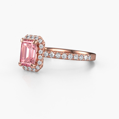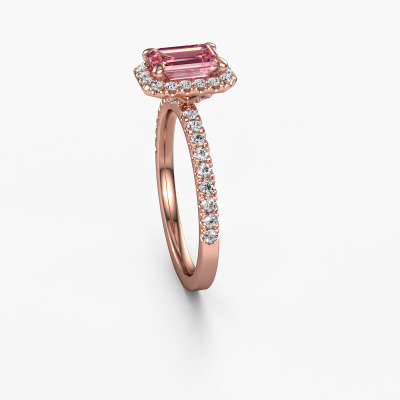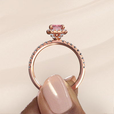 The ring shown above is called the Miranda EME. We call this type of ring a halo ring because it has one centre gemstone and a band that is also pave set with gemstones. The 14 Carat rose gold engagement ring is set with a emerald cut 7x5 mm pink lab grown diamond centre stone and the band is pave set with diamonds. What makes this classic rose gold halo ring special are the smaller sized stones embracing the centre stone. This gorgeous engagement ring is called a halo ring because the smaller gemstones give the centre stone a halo of surrounding light. In order for the smaller stones to enhance the centre stone, they have to be placed so there is no interference of light. And that's when our expert goldsmiths come in. Each individual stone is carefully set in the ring by hand. During manufacturing, light fall is constantly monitored to make sure the special halo is still visible. In the end you get a unique engagement ring, with a pink lab grown diamond of your choosing at its centre. You can imagine the effect of a ring of such significance when you give it to her on her special day to shine. By using a combination of the latest modern techniques, combined with ancient crafting, we can make all our engagement rings in our own studio. Each jewel is made to order. This is advantageous because we can offer you a price you won't find anywhere else.Our designers and goldsmiths work together each day, creating new jewels. Perhaps you have found a nice classic engagement ring somewhere, which can be used to customize your unique ring. Please feel free to contact us. We will make you an offer, based on a fair price/ quality ratio, which will amaze you.To make it easier for you, we offer a 30 day return policy. Check our terms and conditions.