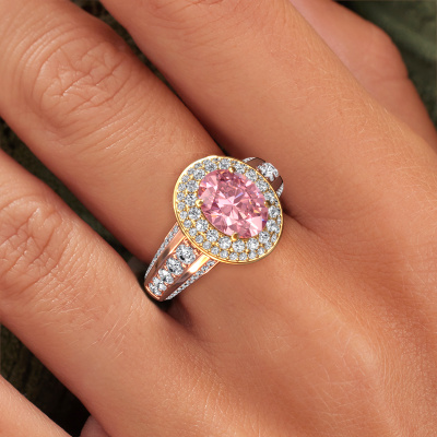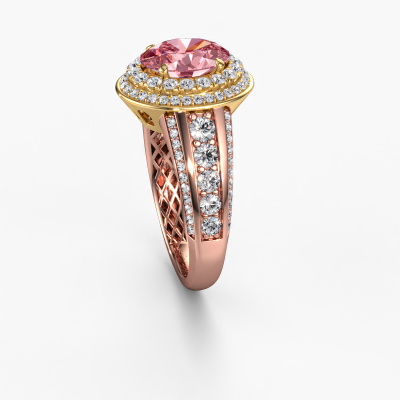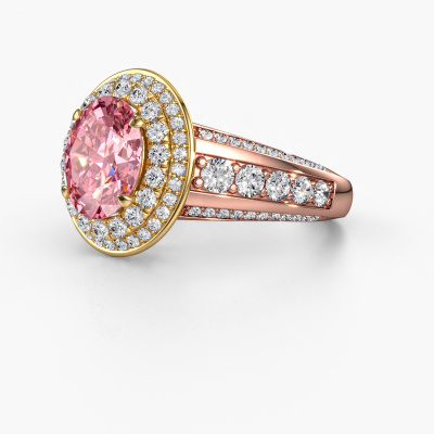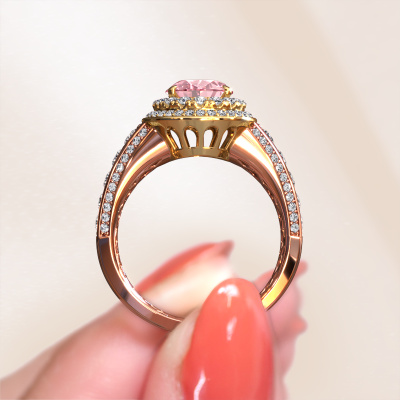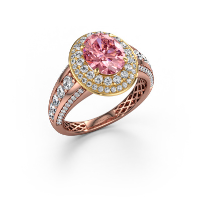 This 14 Carat rose gold ring is called Nancie and is set with 9x7 mm pink lab grown diamond. This exclusive rose gold halo engagement ring is a true work of art! The ornaments are crafted with a lot of patience and great passion. In order to create this ring with great precision, this craft requires a keen eye and skilful hand. A challenge which ignites a fire in our expert goldsmith. The exquisite pink lab grown diamonds are set in a special way so they stand out even more. This gives the ring an even more glamorous appearance. The graceful engagement ring is actually unique on its own because of the gemstones which we carefully select especially for this ring. On top of that you select the precious metals which will be used to create a unique ring for the most extraordinary woman in your life! This jewel is created to add sparkle to your finger, each jewel is lovingly made by hand by our goldsmiths.Are you on a budget? Please feel free to contact us, so we can go discuss your options. We offer our engagement rings at guaranteed best price, because we make them to order. You won't find such a price anywhere else!Our designers and goldsmiths work together each day, creating new jewels. Perhaps you have found a nice classic engagement ring somewhere, which can be used to customize your unique ring. Please feel free to contact us. We will make you an offer, based on a fair price/ quality ratio, which will amaze you.To make it easier for you, we offer a 30 day return policy. Check our terms and conditions.