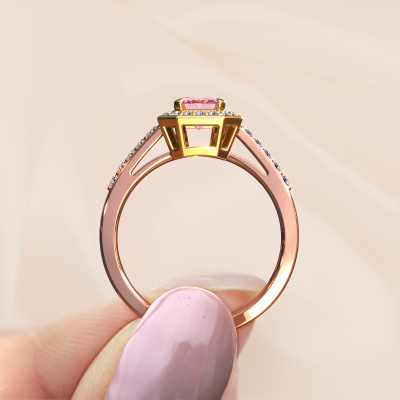 This 14 Carat rose gold ring is called Dodie 2 eme and is set with 7x5 mm pink lab grown diamond. This exclusive rose gold halo engagement ring is a true work of art! The ornaments are crafted with a lot of patience and great passion. In order to create this ring with great precision, this craft requires a keen eye and skilful hand. A challenge which ignites a fire in our expert goldsmith. The exquisite pink lab grown diamonds are set in a special way so they stand out even more. This gives the ring an even more glamorous appearance. The pretty engagement ring is actually unique on its own because of the gemstones which we carefully select especially for this ring. On top of that you select the precious metals which will be used to create a unique ring for the most extraordinary woman in your life! This jewel is made just for you, with attention to detail and design.Because we design and deliver our own rings, we can offer you a engagement ring at a price you won't find anywhere else. A ring is made to order, which helps prevent excess supplies, so we can make you a great price offer. We understand it feels risky, buying your engagement ring online, but we will gladly assist in the designing process, taking your budget into consideration.Do you have a specific ring in mind? One you came across somewhere. Please feel free to tell us your wishes and we will turn your design into a unique engagement ring. You can follow the development of your ring design because we use 3D drawings. This gives you a realistic preview of your design. We will gladly send you a non-binding offer, based on a fair price/ quality ratio. It will amaze you.To make it easier for you, we offer a 30 day return policy. Check our terms and conditions.