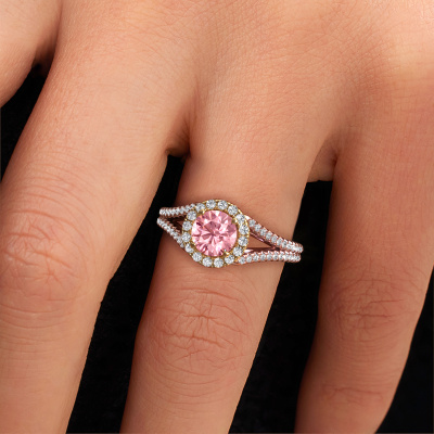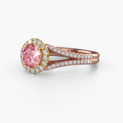This 14 Carat rose gold ring is called Verla rnd 2 and is set with 6.5 mm pink lab grown diamond. This exclusive rose gold halo engagement ring is a true work of art! The ornaments are crafted with a lot of patience and great passion. In order to create this ring with great precision, this craft requires a keen eye and skilful hand. A challenge which ignites a fire in our expert goldsmith. The exquisite pink lab grown diamonds are set in a special way so they stand out even more. This gives the ring an even more glamorous appearance. The split band engagement ring is actually unique on its own because of the gemstones which we carefully select especially for this ring. On top of that you select the precious metals which will be used to create a unique ring for the most extraordinary woman in your life! This jewel is made just for you, with attention to detail and design.Because we design and deliver our own rings, we can offer you a engagement ring at a price you won't find anywhere else. A ring is made to order, which helps prevent excess supplies, so we can make you a great price offer. We understand it feels risky, buying your engagement ring online, but we will gladly assist in the designing process, taking your budget into consideration.Our team adds new designs to our online collection daily. Our designers and goldsmiths work together in creating the best design. We strive to offer a diverse collection of jewels. Perhaps you have a specific jewel design in mind. One you came across somewhere. Please contact us for a free consultation. We will make you an offer, based on a fair price/ quality ratio, that will baffle you.To make it easier for you, we offer a 30 day return policy. Check our terms and conditions.