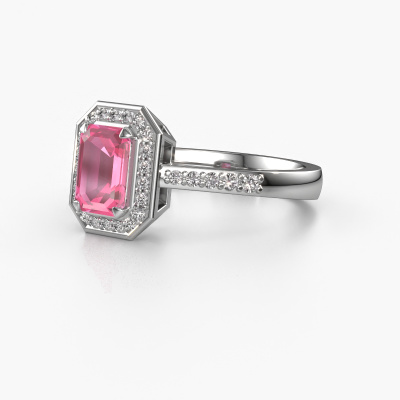 This platinum ring is called Dodie 2 eme and is set with 7x5 mm pink sapphire. This exclusive platinum halo engagement ring is a true work of art! The ornaments are crafted with a lot of patience and great passion. In order to create this ring with great precision, this craft requires a keen eye and skilful hand. A challenge which ignites a fire in our expert goldsmith. The exquisite pink sapphire are set in a special way so they stand out even more. This gives the ring an even more glamorous appearance. The pretty engagement ring is actually unique on its own because of the gemstones which we carefully select especially for this ring. On top of that you select the precious metals which will be used to create a unique ring for the most extraordinary woman in your life! This jewel is made just for you, with attention to detail and design.Because we design and deliver our own rings, we can offer you a engagement ring at a price you won't find anywhere else. A ring is made to order, which helps prevent excess supplies, so we can make you a great price offer. We understand it feels risky, buying your engagement ring online, but we will gladly assist in the designing process, taking your budget into consideration.Do you have a specific ring in mind? One you came across somewhere. Please feel free to tell us your wishes and we will turn your design into a unique engagement ring. You can follow the development of your ring design because we use 3D drawings. This gives you a realistic preview of your design. We will gladly send you a non-binding offer, based on a fair price/ quality ratio. It will amaze you.To make it easier for you, we offer a 30 day return policy. Check our terms and conditions.