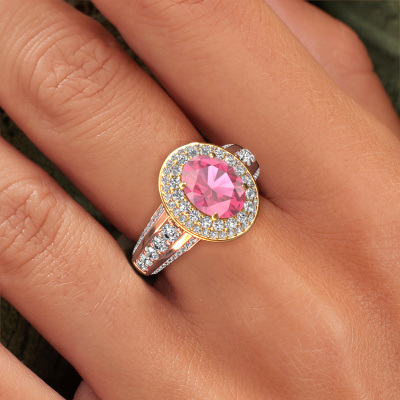 This 14 Carat rose gold ring is called Nancie and is set with 9x7 mm pink sapphire. This exclusive rose gold halo engagement ring is a true work of art! The ornaments are crafted with a lot of patience and great passion. In order to create this ring with great precision, this craft requires a keen eye and skilful hand. A challenge which ignites a fire in our expert goldsmith. The exquisite pink sapphire are set in a special way so they stand out even more. This gives the ring an even more glamorous appearance. The graceful engagement ring is actually unique on its own because of the gemstones which we carefully select especially for this ring. On top of that you select the precious metals which will be used to create a unique ring for the most extraordinary woman in your life! This jewel is created to add sparkle to your finger, each jewel is lovingly made by hand by our goldsmiths.Are you on a budget? Please feel free to contact us, so we can go discuss your options. We offer our engagement rings at guaranteed best price, because we make them to order. You won't find such a price anywhere else!Our designers and goldsmiths work together each day, creating new jewels. Perhaps you have found a nice classic engagement ring somewhere, which can be used to customize your unique ring. Please feel free to contact us. We will make you an offer, based on a fair price/ quality ratio, which will amaze you.To make it easier for you, we offer a 30 day return policy. Check our terms and conditions.