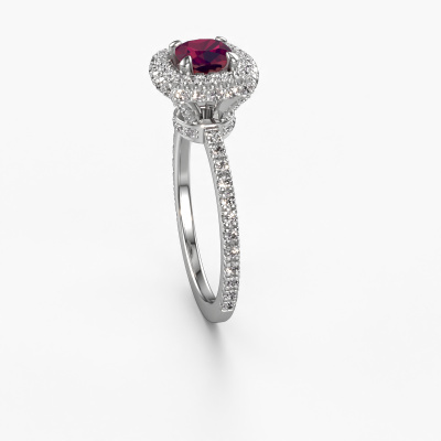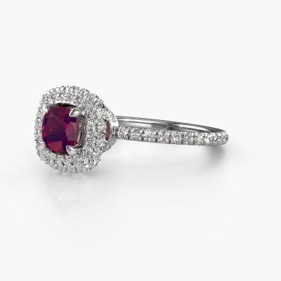 The ring shown above is called the Talitha CUS. We call this type of ring a halo ring because it has one centre gemstone and a band that is also pave set with gemstones. The platinum engagement ring is set with a cushion 5 mm rhodolite centre stone and the band is pave set with diamonds. What makes this traditional platinum halo ring special are the smaller sized stones embracing the centre stone. This gorgeous engagement ring is called a halo ring because the smaller gemstones give the centre stone a halo of surrounding light. In order for the smaller stones to enhance the centre stone, they have to be placed so there is no interference of light. And that's when our expert goldsmiths come in. Each individual stone is carefully set in the ring by hand. During manufacturing, light fall is constantly monitored to make sure the special halo is still visible. In the end you get a unique engagement ring, with a rhodolite of your choosing at its centre. You can imagine the effect of a ring of such significance when you give it to her on her special day to shine. Because we design and deliver our own rings, we can offer you a engagement ring at a price you won't find anywhere else. A ring is made to order, which helps prevent excess supplies, so we can make you a great price offer. We understand it feels risky, buying your engagement ring online, but we will gladly assist in the designing process, taking your budget into consideration.Our designers and goldsmiths work together each day, creating new jewels. Perhaps you have found a nice traditional engagement ring somewhere, which can be used to customize your unique ring. Please feel free to contact us. We will make you an offer, based on a fair price/ quality ratio, which will amaze you.To make it easier for you, we offer a 30 day return policy. Check our terms and conditions.