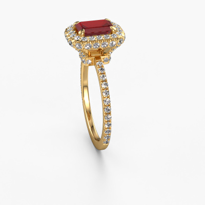 The ring shown above is called the Talitha EME. We call this type of ring a halo ring because it has one centre gemstone and a band that is also pave set with gemstones. The 14 Carat gold engagement ring is set with a emerald cut 7x5 mm ruby centre stone and the band is pave set with lab-grown diamonds. What makes this luxury gold halo ring special are the smaller sized stones embracing the centre stone. This gorgeous engagement ring is called a halo ring because the smaller gemstones give the centre stone a halo of surrounding light. In order for the smaller stones to enhance the centre stone, they have to be placed so there is no interference of light. And that's when our expert goldsmiths come in. Each individual stone is carefully set in the ring by hand. During manufacturing, light fall is constantly monitored to make sure the special halo is still visible. In the end you get a unique engagement ring, with a ruby of your choosing at its centre. You can imagine the effect of a ring of such significance when you give it to her on her special day to shine. By using our modern techniques, we can design and customize the finest quality jewels with the utmost care for you. Our engagement rings are always priced 30 percent lower than other jewellers. We make engagement rings to order so we don't have to maintain a large stock. If you have a certain budget, we are more than happy to advice you accordingly.Our team adds new designs to our online collection daily. Our designers and goldsmiths work together in creating the best design. We strive to offer a diverse collection of jewels. Perhaps you have a specific jewel design in mind. One you came across somewhere. Please contact us for a free consultation. We will make you an offer, based on a fair price/ quality ratio, that will baffle you.To make it easier for you, we offer a 30 day return policy. Check our terms and conditions.