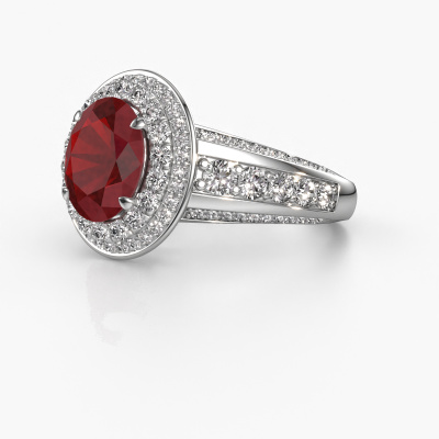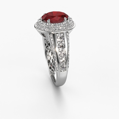 This platinum ring is called Nancie and is set with 9x7 mm ruby. This exclusive platinum halo engagement ring is a true work of art! The ornaments are crafted with a lot of patience and great passion. In order to create this ring with great precision, this craft requires a keen eye and skilful hand. A challenge which ignites a fire in our expert goldsmith. The exquisite ruby are set in a special way so they stand out even more. This gives the ring an even more glamorous appearance. The graceful engagement ring is actually unique on its own because of the gemstones which we carefully select especially for this ring. On top of that you select the precious metals which will be used to create a unique ring for the most extraordinary woman in your life! This jewel is created to add sparkle to your finger, each jewel is lovingly made by hand by our goldsmiths.Are you on a budget? Please feel free to contact us, so we can go discuss your options. We offer our engagement rings at guaranteed best price, because we make them to order. You won't find such a price anywhere else!Our designers and goldsmiths work together each day, creating new jewels. Perhaps you have found a nice classic engagement ring somewhere, which can be used to customize your unique ring. Please feel free to contact us. We will make you an offer, based on a fair price/ quality ratio, which will amaze you.To make it easier for you, we offer a 30 day return policy. Check our terms and conditions.