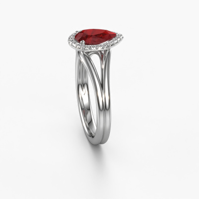 This platinum ring is called Verla pear 1 and is set with 8x6 mm ruby. This exclusive platinum halo engagement ring is a true work of art! The ornaments are crafted with a lot of patience and great passion. In order to create this ring with great precision, this craft requires a keen eye and skilful hand. A challenge which ignites a fire in our expert goldsmith. The exquisite ruby are set in a special way so they stand out even more. This gives the ring an even more glamorous appearance. The graceful engagement ring is actually unique on its own because of the gemstones which we carefully select especially for this ring. On top of that you select the precious metals which will be used to create a unique ring for the most extraordinary woman in your life! This jewel is made to shine bright around your finger. Each jewel is hand made with love by our goldsmiths.By using a combination of the latest modern techniques, combined with ancient crafting, we can make all our engagement rings in our own studio. Each jewel is made to order. This is advantageous because we can offer you a price you won't find anywhere else.Have you found a specific engagement ring somewhere which you would like to give to your loved one? Please feel free to express your wishes to our jewel designers because we would be honoured to turn your design into a luxury engagement ring. You can follow the development of your ring design because we use 3D drawings. This gives you a realistic preview of how your design will look. You can also preorder a dummy. A dummy is a plastic ring, which can be shaped according your ring design. You can try it on and check if its width and size are suitable for you. We will gladly send you a non-binding offer, based on a fair price/ quality ratio. It will amaze you, considering the quality of the ring and gemstones.To make it easier for you, we offer a 30 day return policy. Check our terms and conditions.