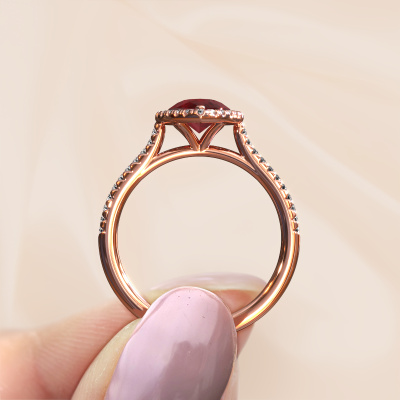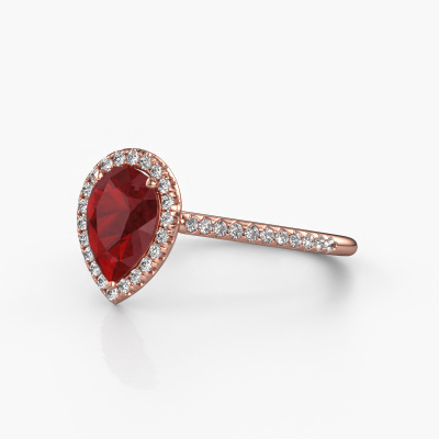 The ring shown above is called the Seline per 2. We call this type of ring a halo ring because it has one centre gemstone and a band that is also pave set with gemstones. The 14 Carat rose gold engagement ring is set with a pear 8x6 mm ruby centre stone and the band is pave set with diamonds. What makes this classic rose gold halo ring special are the smaller sized stones embracing the centre stone. This gorgeous engagement ring is called a halo ring because the smaller gemstones give the centre stone a halo of surrounding light. In order for the smaller stones to enhance the centre stone, they have to be placed so there is no interference of light. And that's when our expert goldsmiths come in. Each individual stone is carefully set in the ring by hand. During manufacturing, light fall is constantly monitored to make sure the special halo is still visible. In the end you get a unique engagement ring, with a ruby of your choosing at its centre. You can imagine the effect of a ring of such significance when you give it to her on her special day to shine. Because we design and deliver our own rings, we can offer you a engagement ring at a price you won't find anywhere else. A ring is made to order, which helps prevent excess supplies, so we can make you a great price offer. We understand it feels risky, buying your engagement ring online, but we will gladly assist in the designing process, taking your budget into consideration.Our designers and goldsmiths work together each day, creating new jewels. Perhaps you have found a nice classic engagement ring somewhere, which can be used to customize your unique ring. Please feel free to contact us. We will make you an offer, based on a fair price/ quality ratio, which will amaze you.To make it easier for you, we offer a 30 day return policy. Check our terms and conditions.