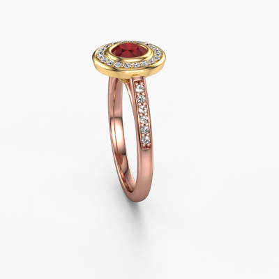 The ring shown above is called the Noud 2 RND. We call this type of ring a halo ring because it has one centre gemstone and a band that is also pave set with gemstones. The 14 Carat rose gold engagement ring is set with a round 5 mm ruby centre stone and the band is pave set with diamonds. What makes this luxury rose gold halo ring special are the smaller sized stones embracing the centre stone. This gorgeous engagement ring is called a halo ring because the smaller gemstones give the centre stone a halo of surrounding light. In order for the smaller stones to enhance the centre stone, they have to be placed so there is no interference of light. And that's when our expert goldsmiths come in. Each individual stone is carefully set in the ring by hand. During manufacturing, light fall is constantly monitored to make sure the special halo is still visible. In the end you get a unique engagement ring, with a ruby of your choosing at its centre. You can imagine the effect of a ring of such significance when you give it to her on her special day to shine. By using a combination of the latest modern techniques, combined with ancient crafting, we can make all our engagement rings in our own studio. Each jewel is made to order. This is advantageous because we can offer you a price you won't find anywhere else.Have you found a specific engagement ring somewhere which you would like to give to your loved one? Please feel free to express your wishes to our jewel designers because we would be honoured to turn your design into a luxury engagement ring. You can follow the development of your ring design because we use 3D drawings. This gives you a realistic preview of how your design will look. You can also preorder a dummy. A dummy is a plastic ring, which can be shaped according your ring design. You can try it on and check if its width and size are suitable for you. We will gladly send you a non-binding offer, based on a fair price/ quality ratio. It will amaze you, considering the quality of the ring and gemstones.To make it easier for you, we offer a 30 day return policy. Check our terms and conditions.
