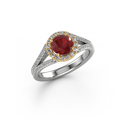 This 14 Carat white gold ring is called Verla rnd 2 and is set with 6.5 mm ruby. This exclusive white gold halo engagement ring is a true work of art! The ornaments are crafted with a lot of patience and great passion. In order to create this ring with great precision, this craft requires a keen eye and skilful hand. A challenge which ignites a fire in our expert goldsmith. The exquisite ruby are set in a special way so they stand out even more. This gives the ring an even more glamorous appearance. The split band engagement ring is actually unique on its own because of the gemstones which we carefully select especially for this ring. On top of that you select the precious metals which will be used to create a unique ring for the most extraordinary woman in your life! This jewel is made just for you, with attention to detail and design.Because we design and deliver our own rings, we can offer you a engagement ring at a price you won't find anywhere else. A ring is made to order, which helps prevent excess supplies, so we can make you a great price offer. We understand it feels risky, buying your engagement ring online, but we will gladly assist in the designing process, taking your budget into consideration.Our team adds new designs to our online collection daily. Our designers and goldsmiths work together in creating the best design. We strive to offer a diverse collection of jewels. Perhaps you have a specific jewel design in mind. One you came across somewhere. Please contact us for a free consultation. We will make you an offer, based on a fair price/ quality ratio, that will baffle you.To make it easier for you, we offer a 30 day return policy. Check our terms and conditions.