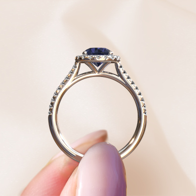 The ring shown above is called the Seline rnd 2. We call this type of ring a halo ring because it has one centre gemstone and a band that is also pave set with gemstones. The 14 Carat white gold engagement ring is set with a round 6.5 mm sapphire centre stone and the band is pave set with lab-grown diamonds. What makes this exclusive white gold halo ring special are the smaller sized stones embracing the centre stone. This gorgeous engagement ring is called a halo ring because the smaller gemstones give the centre stone a halo of surrounding light. In order for the smaller stones to enhance the centre stone, they have to be placed so there is no interference of light. And that's when our expert goldsmiths come in. Each individual stone is carefully set in the ring by hand. During manufacturing, light fall is constantly monitored to make sure the special halo is still visible. In the end you get a unique engagement ring, with a sapphire of your choosing at its centre. You can imagine the effect of a ring of such significance when you give it to her on her special day to shine. After receiving your order, our goldsmiths will start the creative process of making your Seline rnd 2 engagement ring. We don't keep stock. This is advantageous because these costs will not be passed on to you. Therefore, we can offer jewellery at exceptionally low prices.Our team adds new designs to our online collection daily. Our designers and goldsmiths work together in creating the best design. We strive to offer a diverse collection of jewels. Perhaps you have a specific jewel design in mind. One you came across somewhere. Please contact us for a free consultation. We will make you an offer, based on a fair price/ quality ratio, that will baffle you.To make it easier for you, we offer a 30 day return policy. Check our terms and conditions.