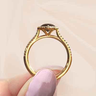 The ring shown above is called the Seline per 2. We call this type of ring a halo ring because it has one centre gemstone and a band that is also pave set with gemstones. The 14 Carat gold engagement ring is set with a pear 8x6 mm smokey quartz centre stone and the band is pave set with diamonds. What makes this classic gold halo ring special are the smaller sized stones embracing the centre stone. This gorgeous engagement ring is called a halo ring because the smaller gemstones give the centre stone a halo of surrounding light. In order for the smaller stones to enhance the centre stone, they have to be placed so there is no interference of light. And that's when our expert goldsmiths come in. Each individual stone is carefully set in the ring by hand. During manufacturing, light fall is constantly monitored to make sure the special halo is still visible. In the end you get a unique engagement ring, with a smokey quartz of your choosing at its centre. You can imagine the effect of a ring of such significance when you give it to her on her special day to shine. Because we design and deliver our own rings, we can offer you a engagement ring at a price you won't find anywhere else. A ring is made to order, which helps prevent excess supplies, so we can make you a great price offer. We understand it feels risky, buying your engagement ring online, but we will gladly assist in the designing process, taking your budget into consideration.Our designers and goldsmiths work together each day, creating new jewels. Perhaps you have found a nice classic engagement ring somewhere, which can be used to customize your unique ring. Please feel free to contact us. We will make you an offer, based on a fair price/ quality ratio, which will amaze you.To make it easier for you, we offer a 30 day return policy. Check our terms and conditions.