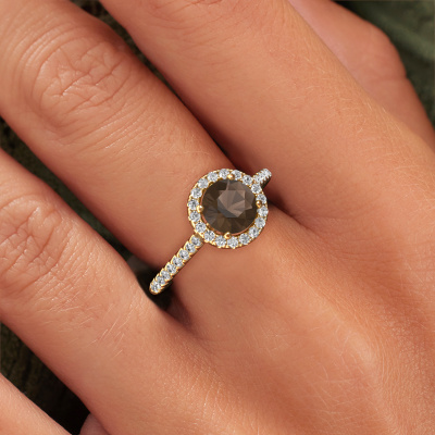 The ring shown above is called the Seline rnd 2. We call this type of ring a halo ring because it has one centre gemstone and a band that is also pave set with gemstones. The 14 Carat gold engagement ring is set with a round 6.5 mm smokey quartz centre stone and the band is pave set with lab-grown diamonds. What makes this exclusive gold halo ring special are the smaller sized stones embracing the centre stone. This gorgeous engagement ring is called a halo ring because the smaller gemstones give the centre stone a halo of surrounding light. In order for the smaller stones to enhance the centre stone, they have to be placed so there is no interference of light. And that's when our expert goldsmiths come in. Each individual stone is carefully set in the ring by hand. During manufacturing, light fall is constantly monitored to make sure the special halo is still visible. In the end you get a unique engagement ring, with a smokey quartz of your choosing at its centre. You can imagine the effect of a ring of such significance when you give it to her on her special day to shine. After receiving your order, our goldsmiths will start the creative process of making your Seline rnd 2 engagement ring. We don't keep stock. This is advantageous because these costs will not be passed on to you. Therefore, we can offer jewellery at exceptionally low prices.Our team adds new designs to our online collection daily. Our designers and goldsmiths work together in creating the best design. We strive to offer a diverse collection of jewels. Perhaps you have a specific jewel design in mind. One you came across somewhere. Please contact us for a free consultation. We will make you an offer, based on a fair price/ quality ratio, that will baffle you.To make it easier for you, we offer a 30 day return policy. Check our terms and conditions.