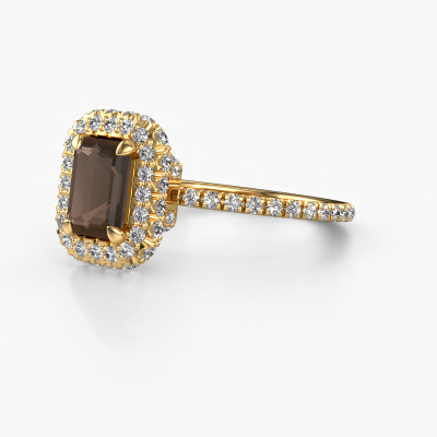 The ring shown above is called the Talitha EME. We call this type of ring a halo ring because it has one centre gemstone and a band that is also pave set with gemstones. The 14 Carat gold engagement ring is set with a emerald cut 7x5 mm smokey quartz centre stone and the band is pave set with lab-grown diamonds. What makes this luxury gold halo ring special are the smaller sized stones embracing the centre stone. This gorgeous engagement ring is called a halo ring because the smaller gemstones give the centre stone a halo of surrounding light. In order for the smaller stones to enhance the centre stone, they have to be placed so there is no interference of light. And that's when our expert goldsmiths come in. Each individual stone is carefully set in the ring by hand. During manufacturing, light fall is constantly monitored to make sure the special halo is still visible. In the end you get a unique engagement ring, with a smokey quartz of your choosing at its centre. You can imagine the effect of a ring of such significance when you give it to her on her special day to shine. By using our modern techniques, we can design and customize the finest quality jewels with the utmost care for you. Our engagement rings are always priced 30 percent lower than other jewellers. We make engagement rings to order so we don't have to maintain a large stock. If you have a certain budget, we are more than happy to advice you accordingly.Our team adds new designs to our online collection daily. Our designers and goldsmiths work together in creating the best design. We strive to offer a diverse collection of jewels. Perhaps you have a specific jewel design in mind. One you came across somewhere. Please contact us for a free consultation. We will make you an offer, based on a fair price/ quality ratio, that will baffle you.To make it easier for you, we offer a 30 day return policy. Check our terms and conditions.