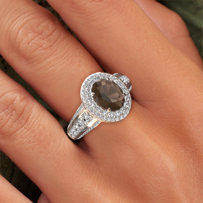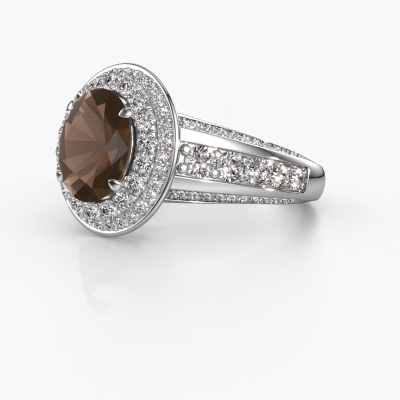 This platinum ring is called Nancie and is set with 9x7 mm smokey quartz. This exclusive platinum halo engagement ring is a true work of art! The ornaments are crafted with a lot of patience and great passion. In order to create this ring with great precision, this craft requires a keen eye and skilful hand. A challenge which ignites a fire in our expert goldsmith. The exquisite smokey quartz are set in a special way so they stand out even more. This gives the ring an even more glamorous appearance. The graceful engagement ring is actually unique on its own because of the gemstones which we carefully select especially for this ring. On top of that you select the precious metals which will be used to create a unique ring for the most extraordinary woman in your life! This jewel is created to add sparkle to your finger, each jewel is lovingly made by hand by our goldsmiths.Are you on a budget? Please feel free to contact us, so we can go discuss your options. We offer our engagement rings at guaranteed best price, because we make them to order. You won't find such a price anywhere else!Our designers and goldsmiths work together each day, creating new jewels. Perhaps you have found a nice classic engagement ring somewhere, which can be used to customize your unique ring. Please feel free to contact us. We will make you an offer, based on a fair price/ quality ratio, which will amaze you.To make it easier for you, we offer a 30 day return policy. Check our terms and conditions.