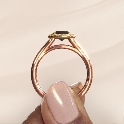 This 14 Carat rose gold ring is called Verla pear 1 and is set with 8x6 mm smokey quartz. This exclusive rose gold halo engagement ring is a true work of art! The ornaments are crafted with a lot of patience and great passion. In order to create this ring with great precision, this craft requires a keen eye and skilful hand. A challenge which ignites a fire in our expert goldsmith. The exquisite smokey quartz are set in a special way so they stand out even more. This gives the ring an even more glamorous appearance. The graceful engagement ring is actually unique on its own because of the gemstones which we carefully select especially for this ring. On top of that you select the precious metals which will be used to create a unique ring for the most extraordinary woman in your life! This jewel is made to shine bright around your finger. Each jewel is hand made with love by our goldsmiths.By using a combination of the latest modern techniques, combined with ancient crafting, we can make all our engagement rings in our own studio. Each jewel is made to order. This is advantageous because we can offer you a price you won't find anywhere else.Have you found a specific engagement ring somewhere which you would like to give to your loved one? Please feel free to express your wishes to our jewel designers because we would be honoured to turn your design into a luxury engagement ring. You can follow the development of your ring design because we use 3D drawings. This gives you a realistic preview of how your design will look. You can also preorder a dummy. A dummy is a plastic ring, which can be shaped according your ring design. You can try it on and check if its width and size are suitable for you. We will gladly send you a non-binding offer, based on a fair price/ quality ratio. It will amaze you, considering the quality of the ring and gemstones.To make it easier for you, we offer a 30 day return policy. Check our terms and conditions.