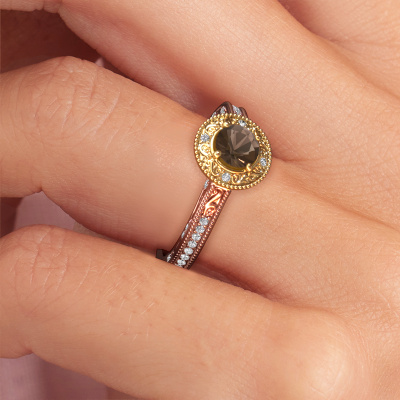 This 14 Carat rose gold ring is called Alice RND and is set with 5 mm smokey quartz. An extraordinary rose gold vintage ring. One that will surely make the love of your life shine like a diamond! That is what we hope to achieve. This vintage Engagement ring is set with exquisite smokey quartz. Whichever gemstone you choose from our selection, is up to you. The gemstone is selected with great care because we believe your pearl edges Engagement ring must be adorned with nothing but the most beautiful gemstone. Wouldn't you agree? Our expert goldsmith will design your ring in our own crafting studio, where the smokey quartz will be set with great precision. The ring will then be polished till it shines perfectly. Nothing but the best for the love of your life! This jewel is made to shine bright around your finger. Each jewel is hand made with love by our goldsmiths.Are you on a budget? Please feel free to contact us, so we can go discuss your options. We offer our Engagement rings at guaranteed best price, because we make them to order. You won't find such a price anywhere else!Our team adds new designs to our online collection daily. Our designers and goldsmiths work together in creating the best design. We strive to offer a diverse collection of jewels. Perhaps you have a specific jewel design in mind. One you came across somewhere. Please contact us for a free consultation. We will make you an offer, based on a fair price/ quality ratio, that will baffle you.To make it easier for you, we offer a 30 day return policy. Check our terms and conditions.