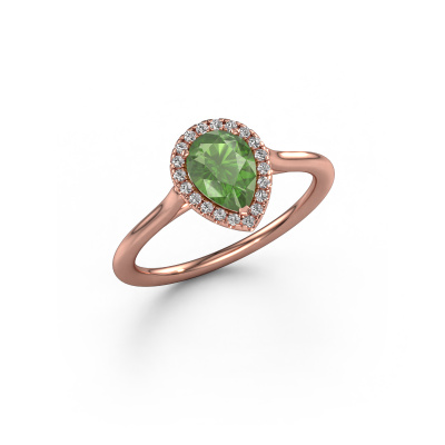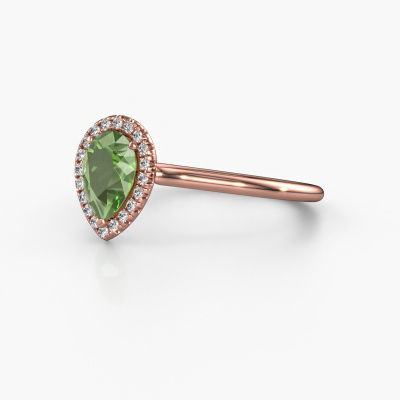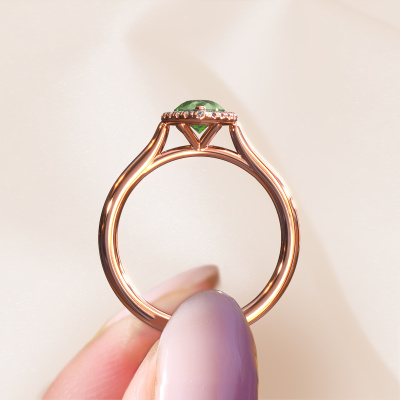 This 14 Carat rose gold ring is called Seline per 1 and is set with 7x5 mm tourmaline green. This exclusive rose gold halo engagement ring is a true work of art! The ornaments are crafted with a lot of patience and great passion. In order to create this ring with great precision, this craft requires a keen eye and skilful hand. A challenge which ignites a fire in our expert goldsmith. The exquisite tourmaline green are set in a special way so they stand out even more. This gives the ring an even more glamorous appearance. The charming engagement ring is actually unique on its own because of the gemstones which we carefully select especially for this ring. On top of that you select the precious metals which will be used to create a unique ring for the most extraordinary woman in your life! This jewel is made with passion and love by one of our master goldsmiths.After receiving your order, our goldsmiths will start the creative process of making your Seline per 1 engagement ring. We don't keep stock. This is advantageous because these costs will not be passed on to you. Therefore, we can offer jewellery at exceptionally low prices.Our team adds new designs to our online collection daily. Our designers and goldsmiths work together in creating the best design. We strive to offer a diverse collection of jewels. Perhaps you have a specific jewel design in mind. One you came across somewhere. Please contact us for a free consultation. We will make you an offer, based on a fair price/ quality ratio, that will baffle you.To make it easier for you, we offer a 30 day return policy. Check our terms and conditions.