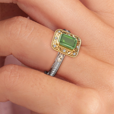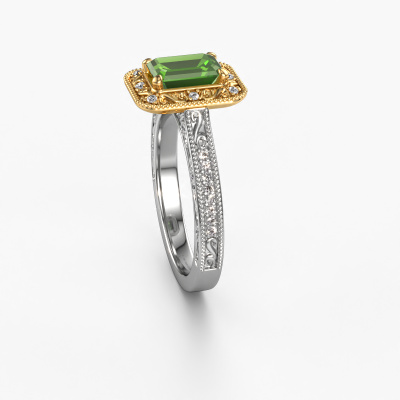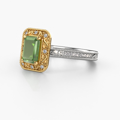 This 14 Carat white gold ring is called Alice EME and is set with 7x5 mm tourmaline green. An extraordinary white gold vintage ring. One that will surely make the love of your life shine like a diamond! That is what we hope to achieve. This vintage Engagement ring is set with exquisite tourmaline green. Whichever gemstone you choose from our selection, is up to you. The gemstone is selected with great care because we believe your pearl edges Engagement ring must be adorned with nothing but the most beautiful gemstone. Wouldn't you agree? Our expert goldsmith will design your ring in our own crafting studio, where the tourmaline green will be set with great precision. The ring will then be polished till it shines perfectly. Nothing but the best for the love of your life! This jewel is made just for you by our master goldsmiths in our own studio.By using a combination of the latest modern techniques, combined with ancient crafting, we can make all our Engagement rings in our own studio. Each jewel is made to order. This is advantageous because we can offer you a price you won't find anywhere else.Do you have a specific ring in mind? One you came across somewhere. Please feel free to tell us your wishes and we will turn your design into a unique Engagement ring. You can follow the development of your ring design because we use 3D drawings. This gives you a realistic preview of your design. We will gladly send you a non-binding offer, based on a fair price/ quality ratio. It will amaze you.To make it easier for you, we offer a 30 day return policy. Check our terms and conditions.
