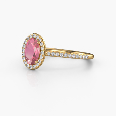The ring shown above is called the Seline ovl 2. We call this type of ring a halo ring because it has one centre gemstone and a band that is also pave set with gemstones. The 14 Carat gold engagement ring is set with a oval 7x5 mm tourmaline pink centre stone and the band is pave set with diamonds. What makes this exclusive gold halo ring special are the smaller sized stones embracing the centre stone. This gorgeous engagement ring is called a halo ring because the smaller gemstones give the centre stone a halo of surrounding light. In order for the smaller stones to enhance the centre stone, they have to be placed so there is no interference of light. And that's when our expert goldsmiths come in. Each individual stone is carefully set in the ring by hand. During manufacturing, light fall is constantly monitored to make sure the special halo is still visible. In the end you get a unique engagement ring, with a tourmaline pink of your choosing at its centre. You can imagine the effect of a ring of such significance when you give it to her on her special day to shine. After receiving your order, our goldsmiths will start the creative process of making your Seline ovl 2 engagement ring. We don't keep stock. This is advantageous because these costs will not be passed on to you. Therefore, we can offer jewellery at exceptionally low prices.Our team adds new designs to our online collection daily. Our designers and goldsmiths work together in creating the best design. We strive to offer a diverse collection of jewels. Perhaps you have a specific jewel design in mind. One you came across somewhere. Please contact us for a free consultation. We will make you an offer, based on a fair price/ quality ratio, that will baffle you.To make it easier for you, we offer a 30 day return policy. Check our terms and conditions.