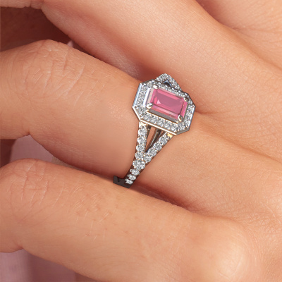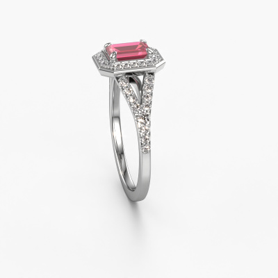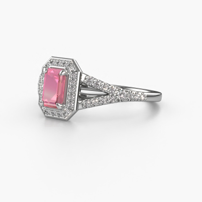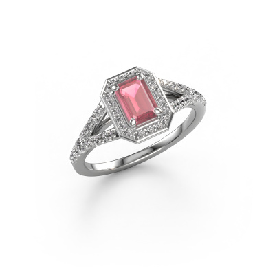 This platinum ring is called Pamela EME and is set with 6x4 mm tourmaline pink. This exclusive platinum halo engagement ring is a true work of art! The ornaments are crafted with a lot of patience and great passion. In order to create this ring with great precision, this craft requires a keen eye and skilful hand. A challenge which ignites a fire in our expert goldsmith. The exquisite tourmaline pink are set in a special way so they stand out even more. This gives the ring an even more glamorous appearance. The split band engagement ring is actually unique on its own because of the gemstones which we carefully select especially for this ring. On top of that you select the precious metals which will be used to create a unique ring for the most extraordinary woman in your life! This jewel is made just for you, with attention to detail and design.Because we design and deliver our own rings, we can offer you a engagement ring at a price you won't find anywhere else. A ring is made to order, which helps prevent excess supplies, so we can make you a great price offer. We understand it feels risky, buying your engagement ring online, but we will gladly assist in the designing process, taking your budget into consideration.Our team adds new designs to our online collection daily. Our designers and goldsmiths work together in creating the best design. We strive to offer a diverse collection of jewels. Perhaps you have a specific jewel design in mind. One you came across somewhere. Please contact us for a free consultation. We will make you an offer, based on a fair price/ quality ratio, that will baffle you.To make it easier for you, we offer a 30 day return policy. Check our terms and conditions.