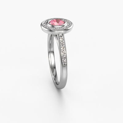 The ring shown above is called the Noud 2 RND. We call this type of ring a halo ring because it has one centre gemstone and a band that is also pave set with gemstones. The platinum engagement ring is set with a round 5 mm tourmaline pink centre stone and the band is pave set with diamonds. What makes this luxury platinum halo ring special are the smaller sized stones embracing the centre stone. This gorgeous engagement ring is called a halo ring because the smaller gemstones give the centre stone a halo of surrounding light. In order for the smaller stones to enhance the centre stone, they have to be placed so there is no interference of light. And that's when our expert goldsmiths come in. Each individual stone is carefully set in the ring by hand. During manufacturing, light fall is constantly monitored to make sure the special halo is still visible. In the end you get a unique engagement ring, with a tourmaline pink of your choosing at its centre. You can imagine the effect of a ring of such significance when you give it to her on her special day to shine. By using a combination of the latest modern techniques, combined with ancient crafting, we can make all our engagement rings in our own studio. Each jewel is made to order. This is advantageous because we can offer you a price you won't find anywhere else.Have you found a specific engagement ring somewhere which you would like to give to your loved one? Please feel free to express your wishes to our jewel designers because we would be honoured to turn your design into a luxury engagement ring. You can follow the development of your ring design because we use 3D drawings. This gives you a realistic preview of how your design will look. You can also preorder a dummy. A dummy is a plastic ring, which can be shaped according your ring design. You can try it on and check if its width and size are suitable for you. We will gladly send you a non-binding offer, based on a fair price/ quality ratio. It will amaze you, considering the quality of the ring and gemstones.To make it easier for you, we offer a 30 day return policy. Check our terms and conditions.