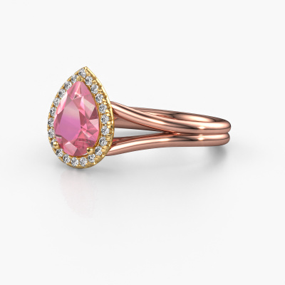 This 14 Carat rose gold ring is called Verla pear 1 and is set with 8x6 mm tourmaline pink. This exclusive rose gold halo engagement ring is a true work of art! The ornaments are crafted with a lot of patience and great passion. In order to create this ring with great precision, this craft requires a keen eye and skilful hand. A challenge which ignites a fire in our expert goldsmith. The exquisite tourmaline pink are set in a special way so they stand out even more. This gives the ring an even more glamorous appearance. The graceful engagement ring is actually unique on its own because of the gemstones which we carefully select especially for this ring. On top of that you select the precious metals which will be used to create a unique ring for the most extraordinary woman in your life! This jewel is made to shine bright around your finger. Each jewel is hand made with love by our goldsmiths.By using a combination of the latest modern techniques, combined with ancient crafting, we can make all our engagement rings in our own studio. Each jewel is made to order. This is advantageous because we can offer you a price you won't find anywhere else.Have you found a specific engagement ring somewhere which you would like to give to your loved one? Please feel free to express your wishes to our jewel designers because we would be honoured to turn your design into a luxury engagement ring. You can follow the development of your ring design because we use 3D drawings. This gives you a realistic preview of how your design will look. You can also preorder a dummy. A dummy is a plastic ring, which can be shaped according your ring design. You can try it on and check if its width and size are suitable for you. We will gladly send you a non-binding offer, based on a fair price/ quality ratio. It will amaze you, considering the quality of the ring and gemstones.To make it easier for you, we offer a 30 day return policy. Check our terms and conditions.
