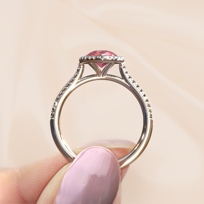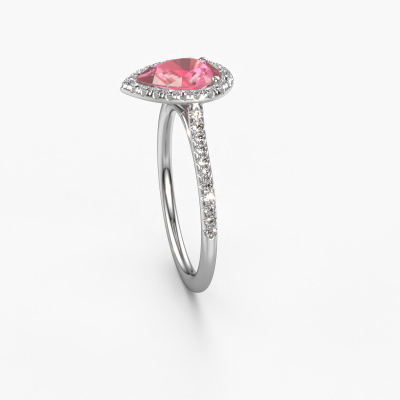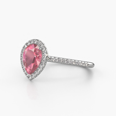 The ring shown above is called the Seline per 2. We call this type of ring a halo ring because it has one centre gemstone and a band that is also pave set with gemstones. The 14 Carat white gold engagement ring is set with a pear 8x6 mm tourmaline pink centre stone and the band is pave set with diamonds. What makes this classic white gold halo ring special are the smaller sized stones embracing the centre stone. This gorgeous engagement ring is called a halo ring because the smaller gemstones give the centre stone a halo of surrounding light. In order for the smaller stones to enhance the centre stone, they have to be placed so there is no interference of light. And that's when our expert goldsmiths come in. Each individual stone is carefully set in the ring by hand. During manufacturing, light fall is constantly monitored to make sure the special halo is still visible. In the end you get a unique engagement ring, with a tourmaline pink of your choosing at its centre. You can imagine the effect of a ring of such significance when you give it to her on her special day to shine. Because we design and deliver our own rings, we can offer you a engagement ring at a price you won't find anywhere else. A ring is made to order, which helps prevent excess supplies, so we can make you a great price offer. We understand it feels risky, buying your engagement ring online, but we will gladly assist in the designing process, taking your budget into consideration.Our designers and goldsmiths work together each day, creating new jewels. Perhaps you have found a nice classic engagement ring somewhere, which can be used to customize your unique ring. Please feel free to contact us. We will make you an offer, based on a fair price/ quality ratio, which will amaze you.To make it easier for you, we offer a 30 day return policy. Check our terms and conditions.