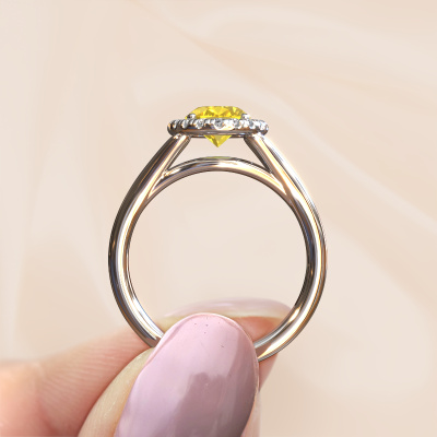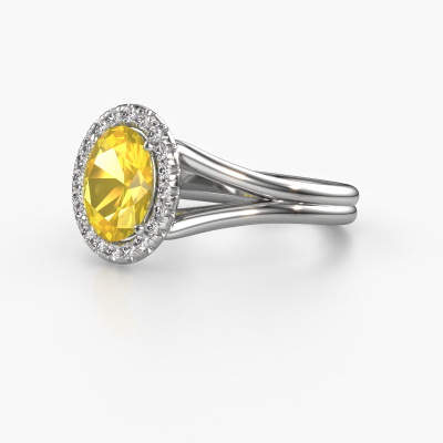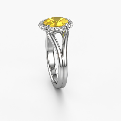 This platinum ring is called Verla ovl 1 and is set with 8x6 mm yellow sapphire. This exclusive platinum halo engagement ring is a true work of art! The ornaments are crafted with a lot of patience and great passion. In order to create this ring with great precision, this craft requires a keen eye and skilful hand. A challenge which ignites a fire in our expert goldsmith. The exquisite yellow sapphire are set in a special way so they stand out even more. This gives the ring an even more glamorous appearance. The split band engagement ring is actually unique on its own because of the gemstones which we carefully select especially for this ring. On top of that you select the precious metals which will be used to create a unique ring for the most extraordinary woman in your life! This jewel is made to shine bright around your finger. Each jewel is hand made with love by our goldsmiths.By using a combination of the latest modern techniques, combined with ancient crafting, we can make all our engagement rings in our own studio. Each jewel is made to order. This is advantageous because we can offer you a price you won't find anywhere else.Do you have a specific ring in mind? One you came across somewhere. Please feel free to tell us your wishes and we will turn your design into a unique engagement ring. You can follow the development of your ring design because we use 3D drawings. This gives you a realistic preview of your design. We will gladly send you a non-binding offer, based on a fair price/ quality ratio. It will amaze you.To make it easier for you, we offer a 30 day return policy. Check our terms and conditions.