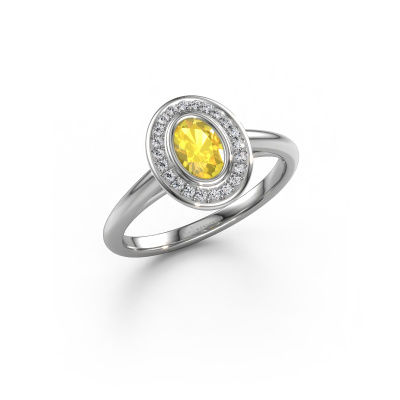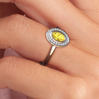The ring shown above is called the Noud 1 OVL. We call this type of ring a halo ring because it has one centre gemstone and a band that is also pave set with gemstones. The platinum engagement ring is set with a oval 6x4 mm yellow sapphire centre stone and the band is pave set with lab-grown diamonds. What makes this classic platinum halo ring special are the smaller sized stones embracing the centre stone. This gorgeous engagement ring is called a halo ring because the smaller gemstones give the centre stone a halo of surrounding light. In order for the smaller stones to enhance the centre stone, they have to be placed so there is no interference of light. And that's when our expert goldsmiths come in. Each individual stone is carefully set in the ring by hand. During manufacturing, light fall is constantly monitored to make sure the special halo is still visible. In the end you get a unique engagement ring, with a yellow sapphire of your choosing at its centre. You can imagine the effect of a ring of such significance when you give it to her on her special day to shine. By using a combination of the latest modern techniques, combined with ancient crafting, we can make all our engagement rings in our own studio. Each jewel is made to order. This is advantageous because we can offer you a price you won't find anywhere else.Our team adds new designs to our online collection daily. Our designers and goldsmiths work together in creating the best design. We strive to offer a diverse collection of jewels. Perhaps you have a specific jewel design in mind. One you came across somewhere. Please contact us for a free consultation. We will make you an offer, based on a fair price/ quality ratio, that will baffle you.To make it easier for you, we offer a 30 day return policy. Check our terms and conditions.