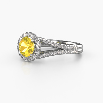 This platinum ring is called Verla rnd 2 and is set with 6.5 mm yellow sapphire. This exclusive platinum halo engagement ring is a true work of art! The ornaments are crafted with a lot of patience and great passion. In order to create this ring with great precision, this craft requires a keen eye and skilful hand. A challenge which ignites a fire in our expert goldsmith. The exquisite yellow sapphire are set in a special way so they stand out even more. This gives the ring an even more glamorous appearance. The split band engagement ring is actually unique on its own because of the gemstones which we carefully select especially for this ring. On top of that you select the precious metals which will be used to create a unique ring for the most extraordinary woman in your life! This jewel is made just for you, with attention to detail and design.Because we design and deliver our own rings, we can offer you a engagement ring at a price you won't find anywhere else. A ring is made to order, which helps prevent excess supplies, so we can make you a great price offer. We understand it feels risky, buying your engagement ring online, but we will gladly assist in the designing process, taking your budget into consideration.Our team adds new designs to our online collection daily. Our designers and goldsmiths work together in creating the best design. We strive to offer a diverse collection of jewels. Perhaps you have a specific jewel design in mind. One you came across somewhere. Please contact us for a free consultation. We will make you an offer, based on a fair price/ quality ratio, that will baffle you.To make it easier for you, we offer a 30 day return policy. Check our terms and conditions.