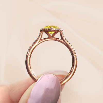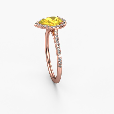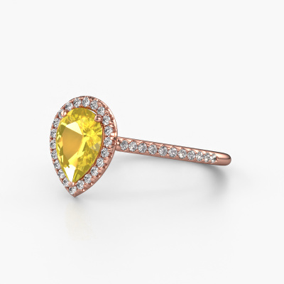 The ring shown above is called the Seline per 2. We call this type of ring a halo ring because it has one centre gemstone and a band that is also pave set with gemstones. The 14 Carat rose gold engagement ring is set with a pear 8x6 mm yellow sapphire centre stone and the band is pave set with diamonds. What makes this classic rose gold halo ring special are the smaller sized stones embracing the centre stone. This gorgeous engagement ring is called a halo ring because the smaller gemstones give the centre stone a halo of surrounding light. In order for the smaller stones to enhance the centre stone, they have to be placed so there is no interference of light. And that's when our expert goldsmiths come in. Each individual stone is carefully set in the ring by hand. During manufacturing, light fall is constantly monitored to make sure the special halo is still visible. In the end you get a unique engagement ring, with a yellow sapphire of your choosing at its centre. You can imagine the effect of a ring of such significance when you give it to her on her special day to shine. Because we design and deliver our own rings, we can offer you a engagement ring at a price you won't find anywhere else. A ring is made to order, which helps prevent excess supplies, so we can make you a great price offer. We understand it feels risky, buying your engagement ring online, but we will gladly assist in the designing process, taking your budget into consideration.Our designers and goldsmiths work together each day, creating new jewels. Perhaps you have found a nice classic engagement ring somewhere, which can be used to customize your unique ring. Please feel free to contact us. We will make you an offer, based on a fair price/ quality ratio, which will amaze you.To make it easier for you, we offer a 30 day return policy. Check our terms and conditions.
